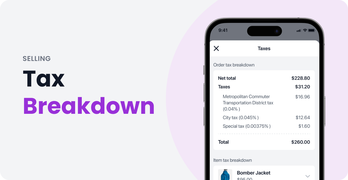 Sales associates are now equipped with the tax breakdown, enabling them to assist shoppers more effectively when inquired about the taxes being charged. As the associate taps on the Taxes summary line on the cart, the tax breakdown will be visible. It is now possible to see the state, city and special taxes with the percentages and amounts, along with the net and gross amounts of the order. Below the order tax breakdown, associates can see the tax breakdown per item.